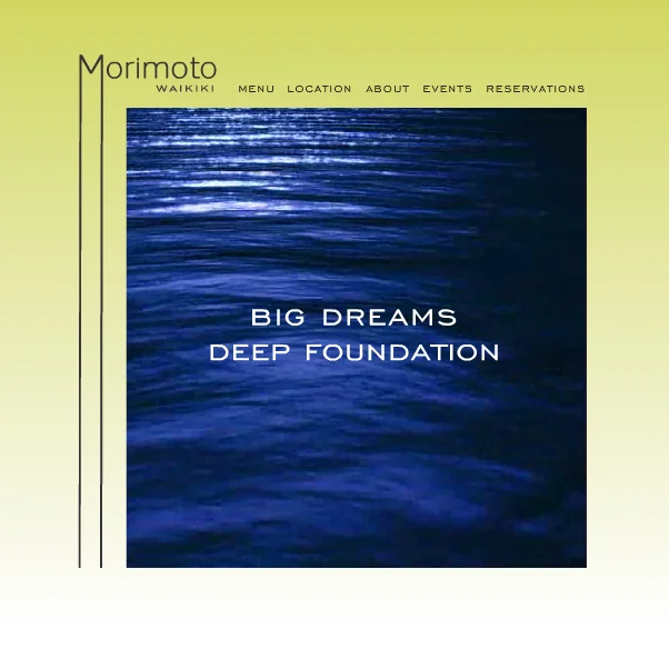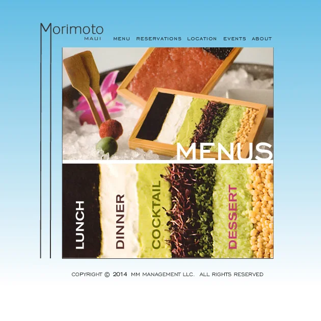 Several years ago, before the advent of mobile web devices, Morimoto restaurants asked me to create websites for their newer restaurants based on the branding Schoos Design had created (see Branding-Morimoto). I created the sites in Flash because the design concept needed to be similar to the existing sites for other Morimoto restaurants (which used Flash) and because the minimalist design was perfect for the modernist brand. Morimoto's ownership has been very happy with the sites and I continue to modify and update them to this day. Unlike many Flash sites that have long load times, I designed the Morimoto sites to load quickly with many nested "movies" that only load as needed. Once mobile sites became indispensable, I created mobile versions of these sites which consist of conventional web pages optimized for mobile viewing.